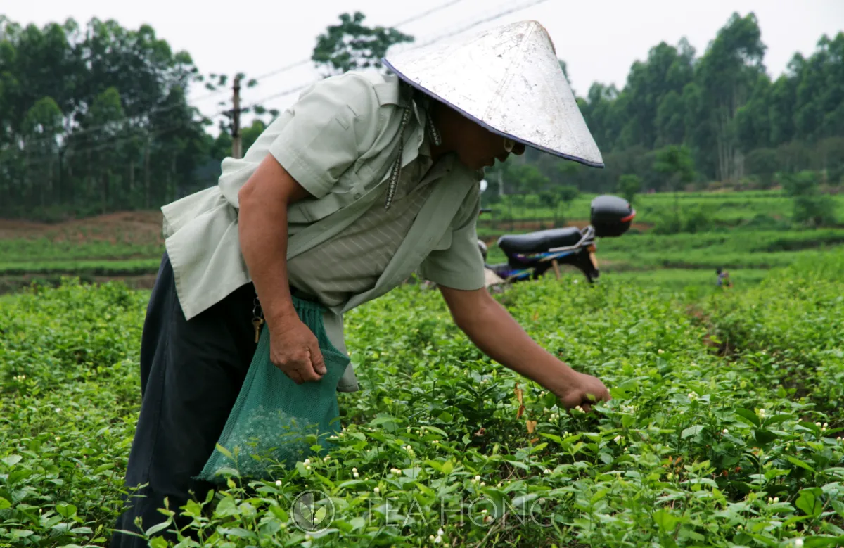 Mr Wu said he has to be picking the whole morning whenever the jasmine flowers are about to bloom or else the open flowers would sell for much less. Hang Xian, Guangxi, China. Traditional tea scenting requires jasmine buds that have not bloomed. Notice that he uses a net as the bag for the flower buds. This is vital in maintaining ventilation to prevent the flowers blooming before the actual scenting begins.